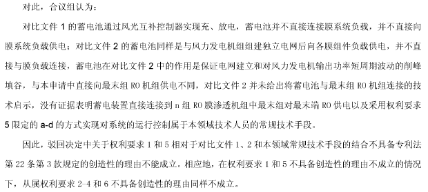 我们针对此,陈述了“蓄电装置的电力输出端通过蓄电池开关直接连接到n组RO膜渗透机组中最末组的电力输入端”在对比文件2中没有得到明确的教导。本发明的蓄电装置向RO膜渗透机组供电时,并不是简单的给所有的机组或者其中的某一个或者其中的某几个机组供电,而是特别地仅给RO膜渗透机组中的最末组供电,这一区别特征体现了本发明不同于现有技术的独特之处。其作用通过阅读本发明可以知道是更好地控制和平衡风力与蓄电装置对RO膜渗透机组的供电。因此,对比文件2公开是蓄电装置与风力发电独立组网后向膜组件供电,其调节多支独立膜组件仅是为了削峰填谷,与本案直接供电完全是二码事。